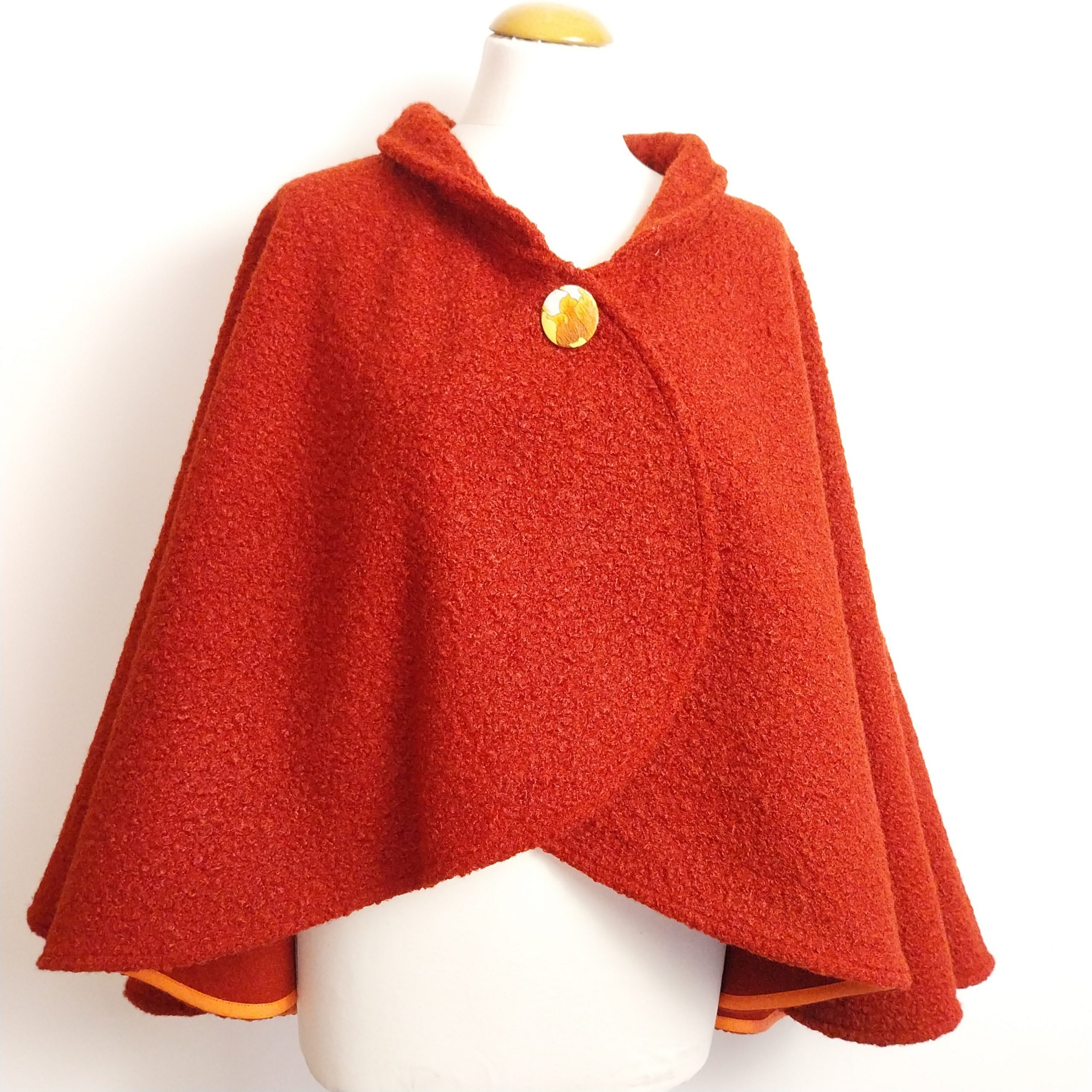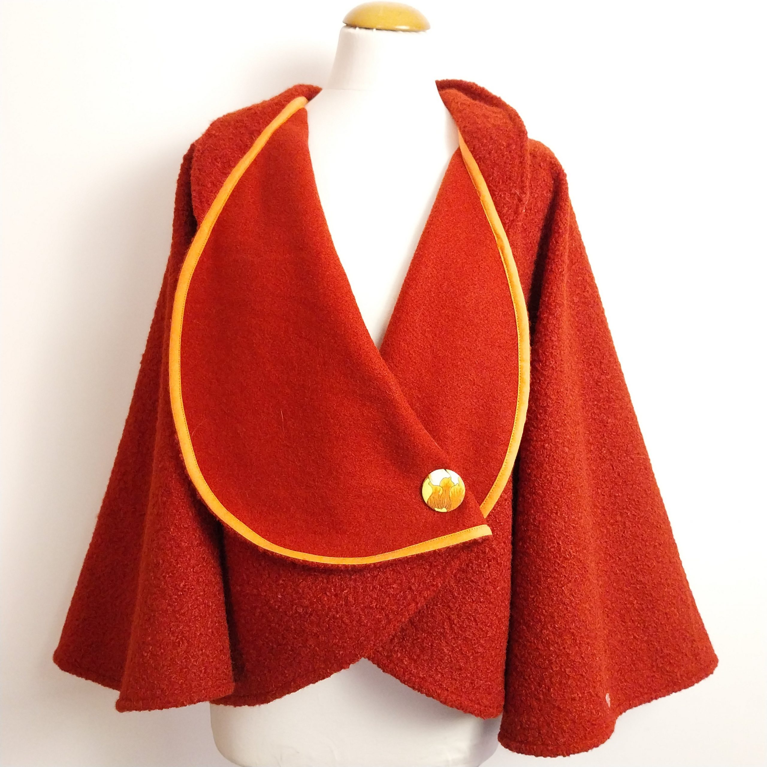 Elle se porte de plusieurs façons : ouverte à l’avant avec ses pans rabattus, un pan jeté sur l’épaule, croisés devant avec une ceinture dans un esprit kimono, fermée par le badge fourni avec ou par une jolie broche, etc…