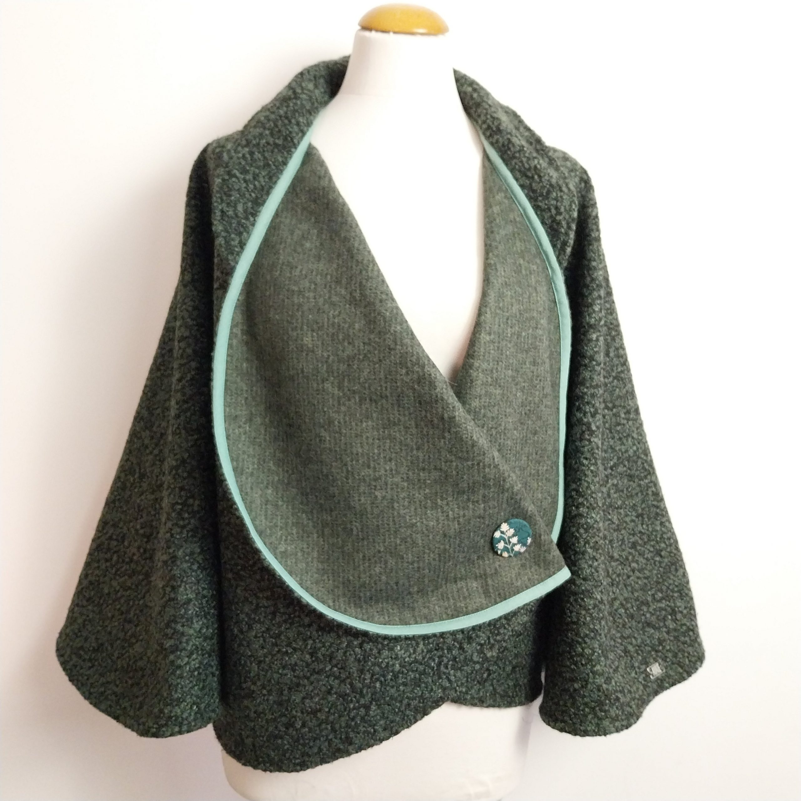 Elle se porte de plusieurs façons : ouverte à l’avant avec ses pans rabattus, un pan jeté sur l’épaule, croisés devant avec une ceinture dans un esprit kimono, fermée par le badge fourni avec ou par une jolie broche, etc…