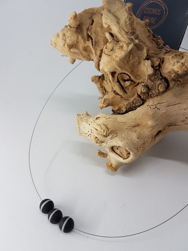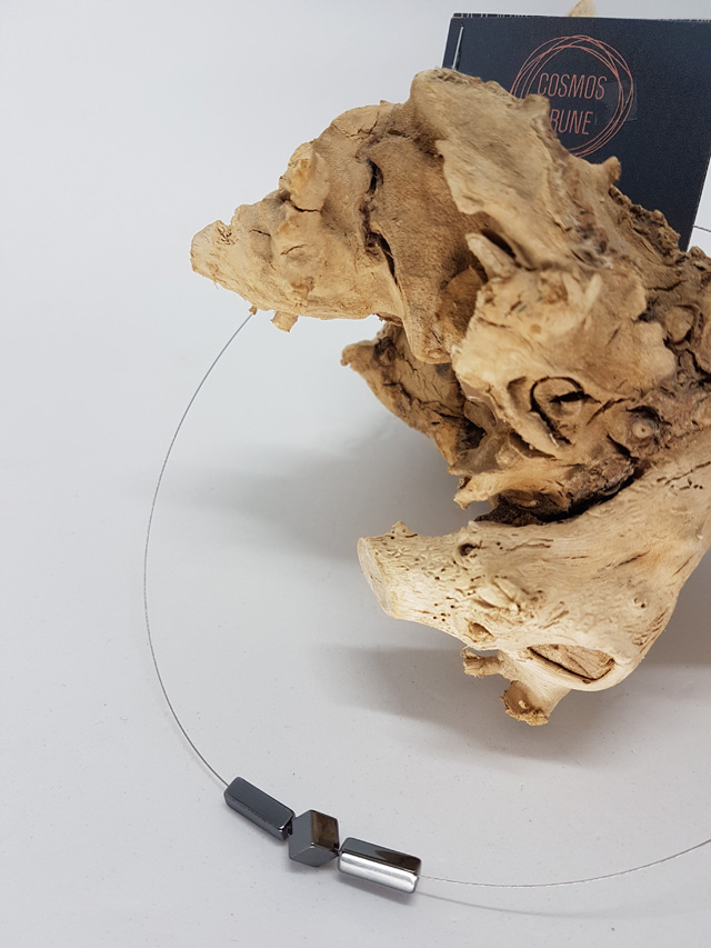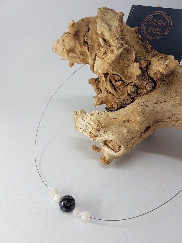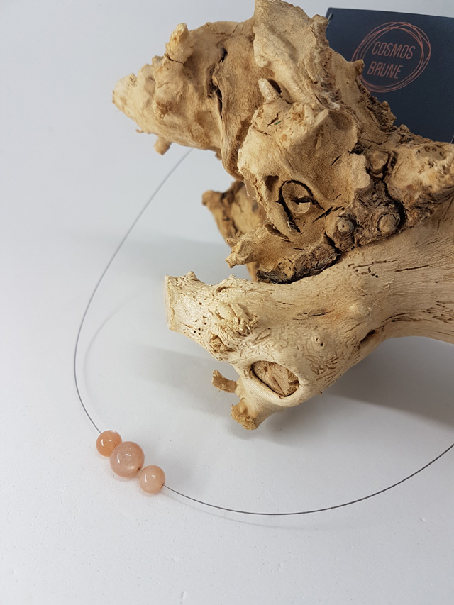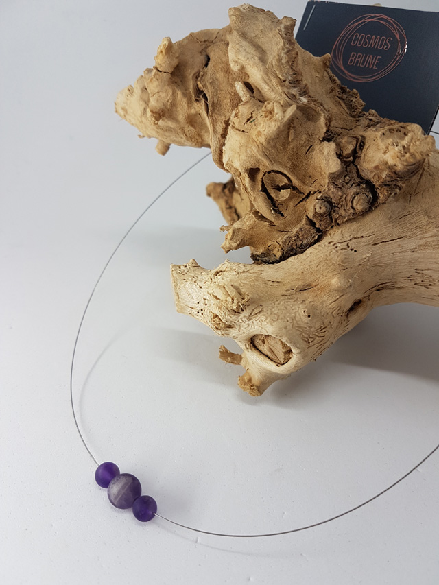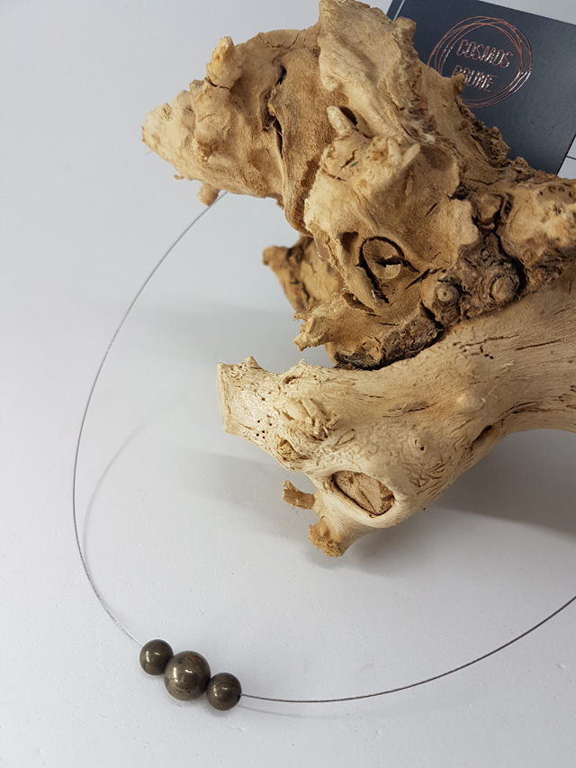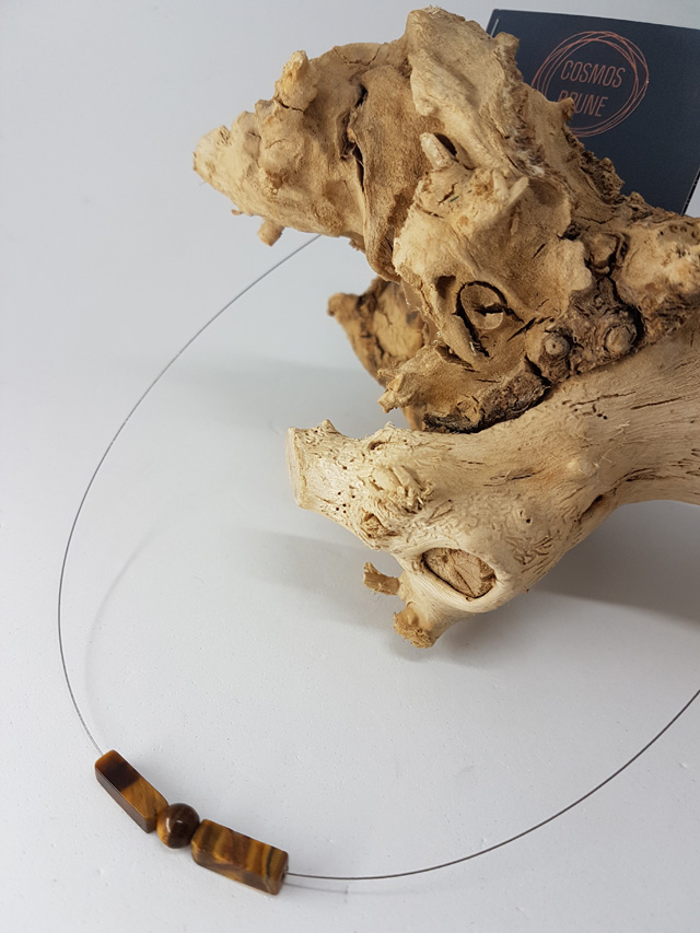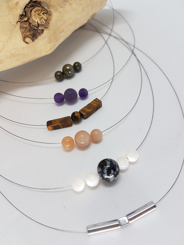 Collier en pierres naturelles montées sur câble d’acier recouvert d’une très fine couche de plastique pour plus d’aisance et de longévité, agrémenté d’une chainette de rallonge pour un ajustement adapté à différents tour de cou.