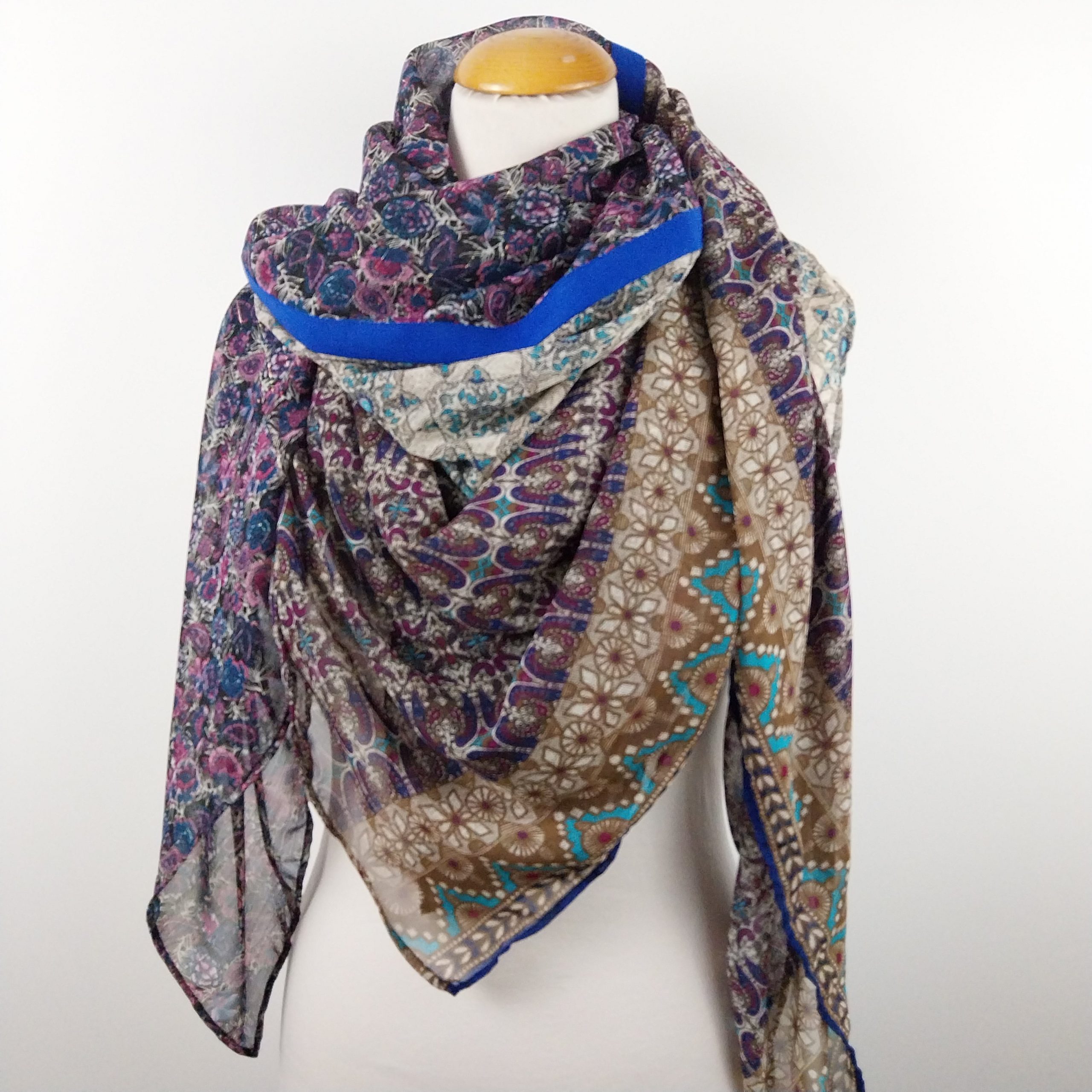 Vous pourrez ainsi changer de look selon votre tenue en choisissant de le porter en triangle avec le motif de votre choix, ou de façon traditionnelle, noué ou jeté sur l’épaule par exemple.