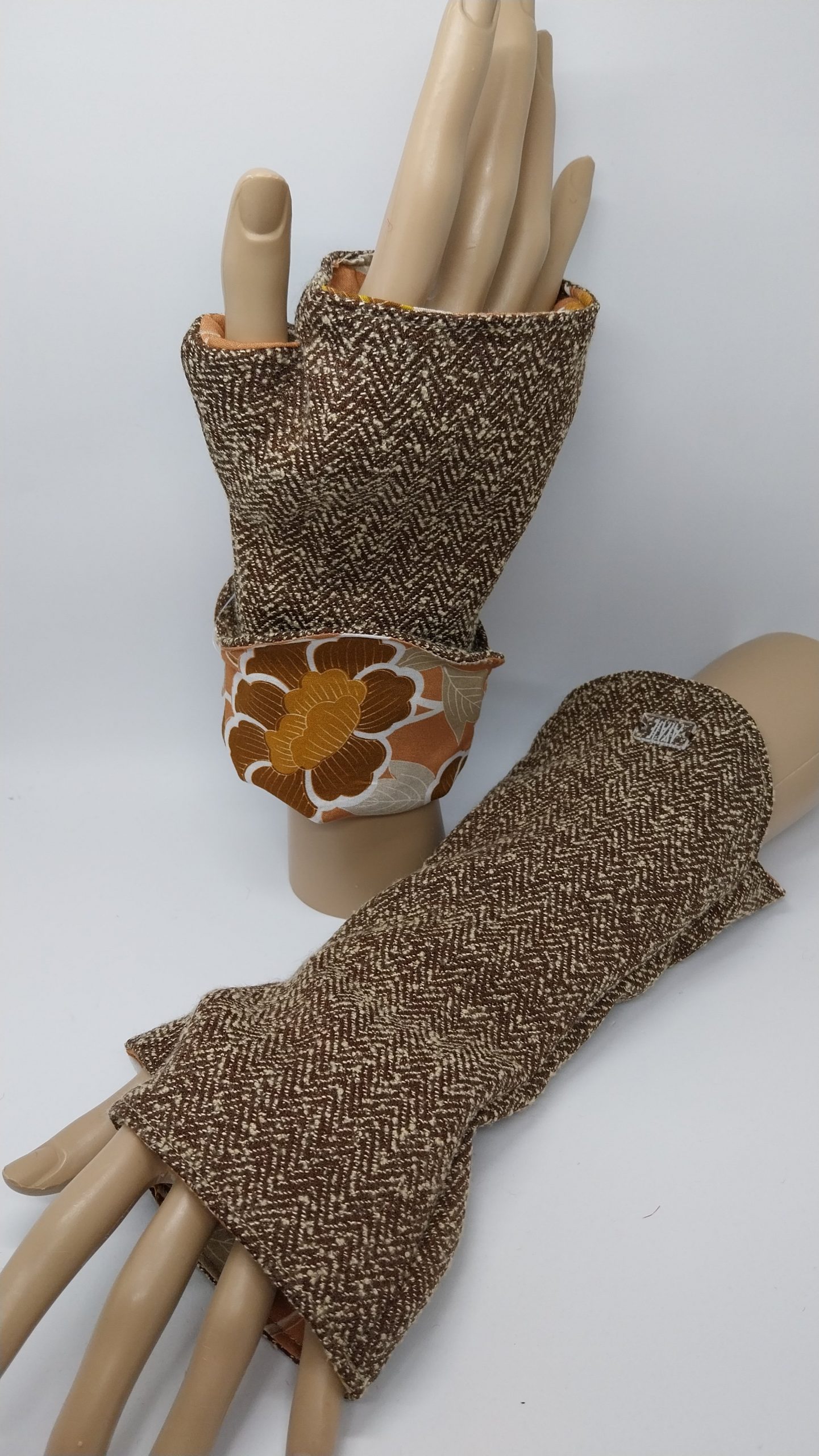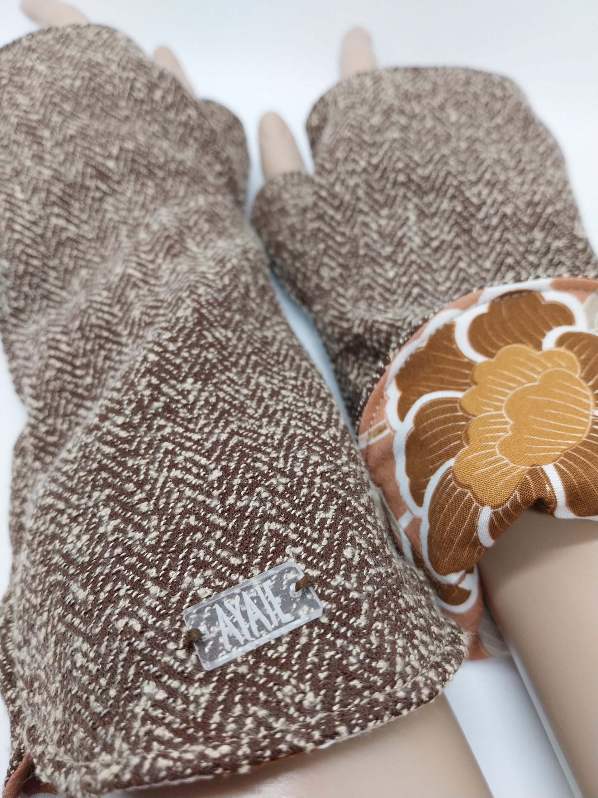 Mitaines n°26 de la marque Ayaïe. Pièce unique et originale réalisées en tissus surcyclés. Accessoire pratique et confortable